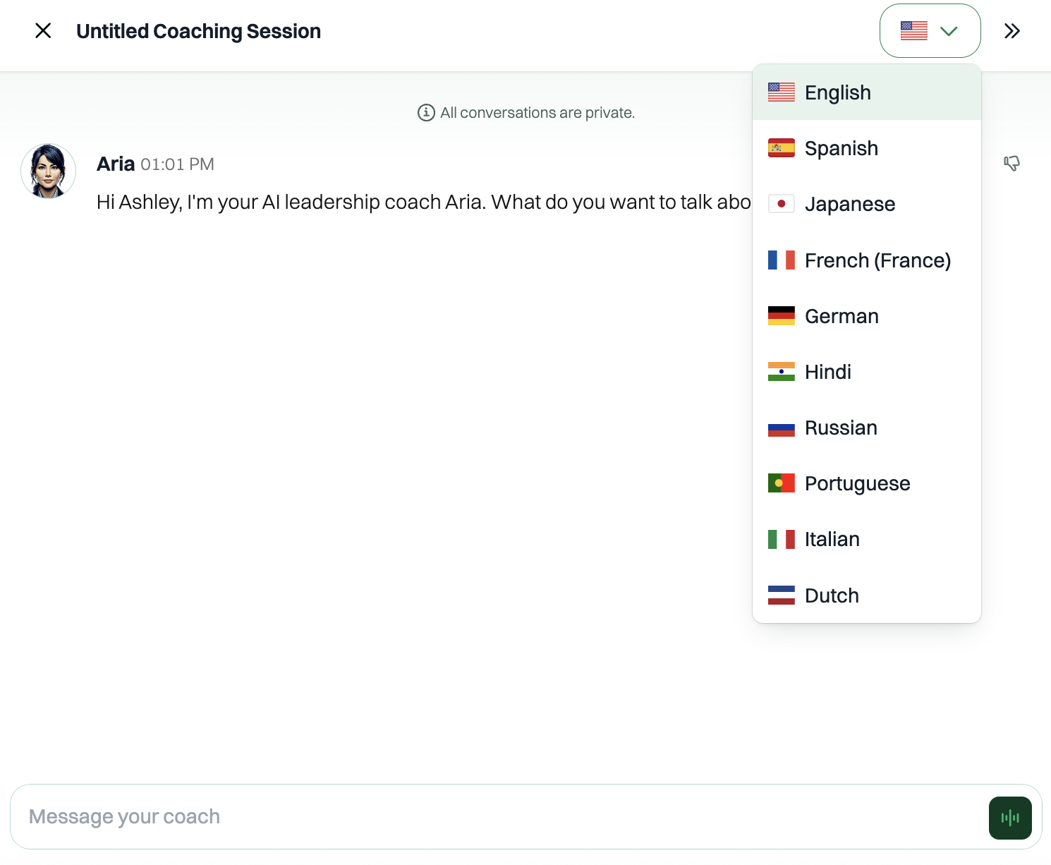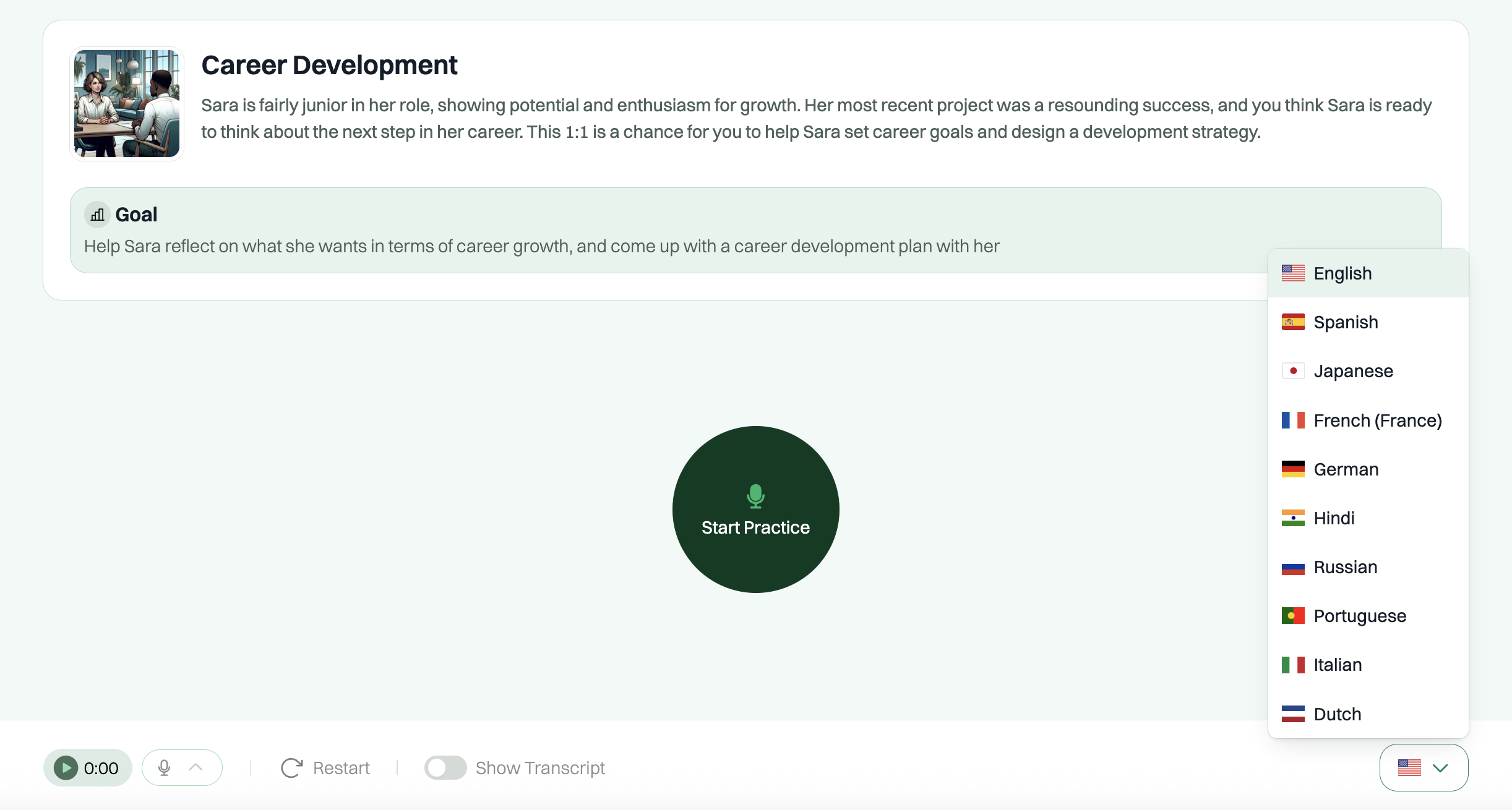The Roleplay Practice experience and AI Coach sessions are localized in all 10 languages. Currently, other elements of the user interface (e.g. buttons) are only available in Spanish and English, but we expect to expand this interface localization to more languages soon.