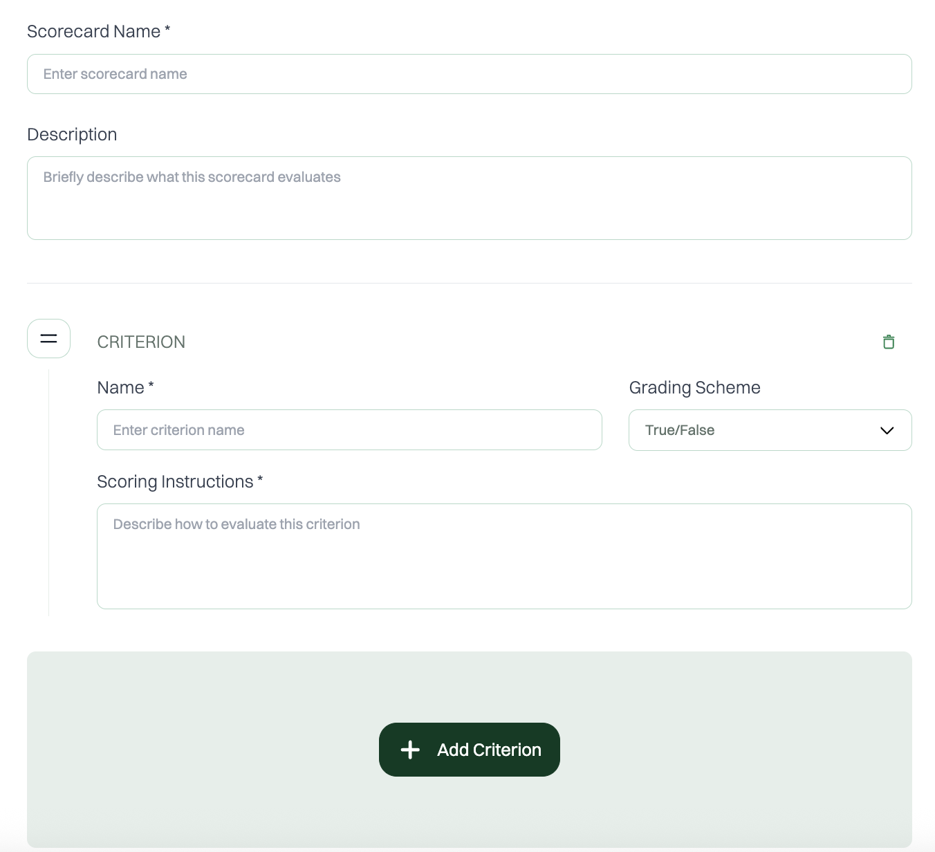 - Add as many Criterion as needed to fully capture your evaluation areas.