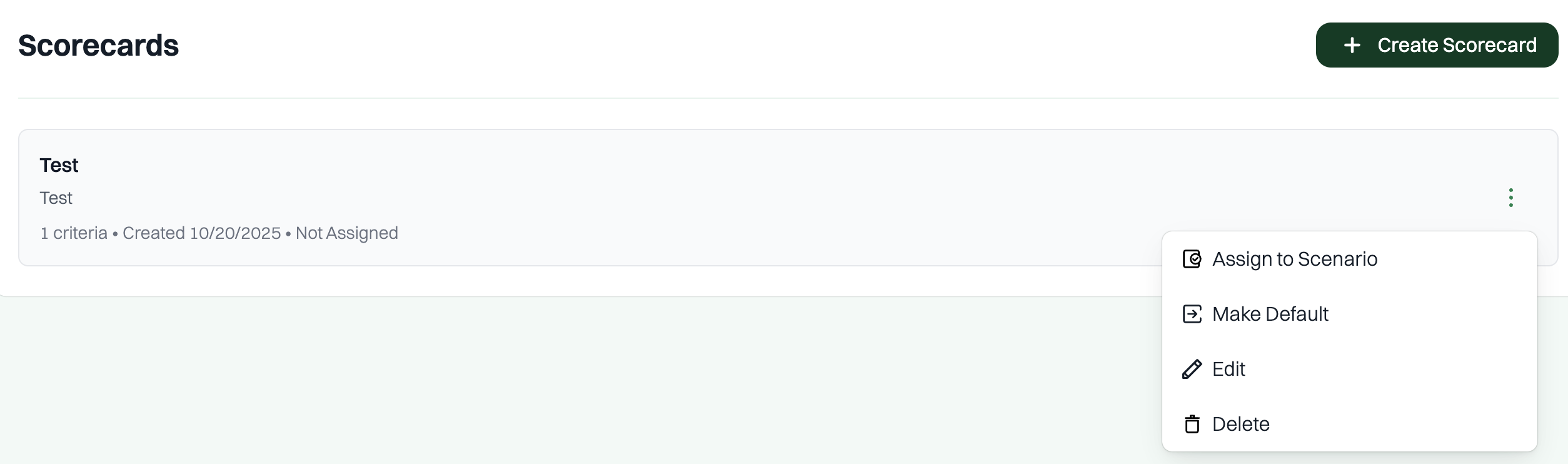 - Edit: Reopen and adjust the Scorecard’s details or criteria.