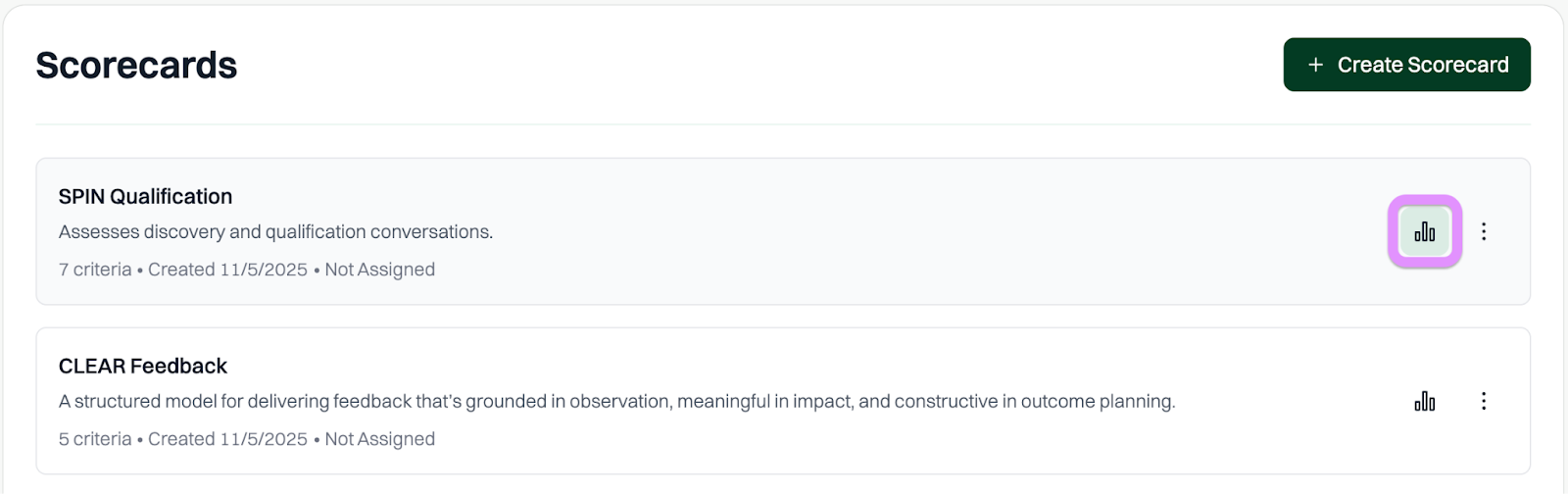 - Scorecard Analytics show submission counts, pass rates, and per-criterion performance for each scored scenario.