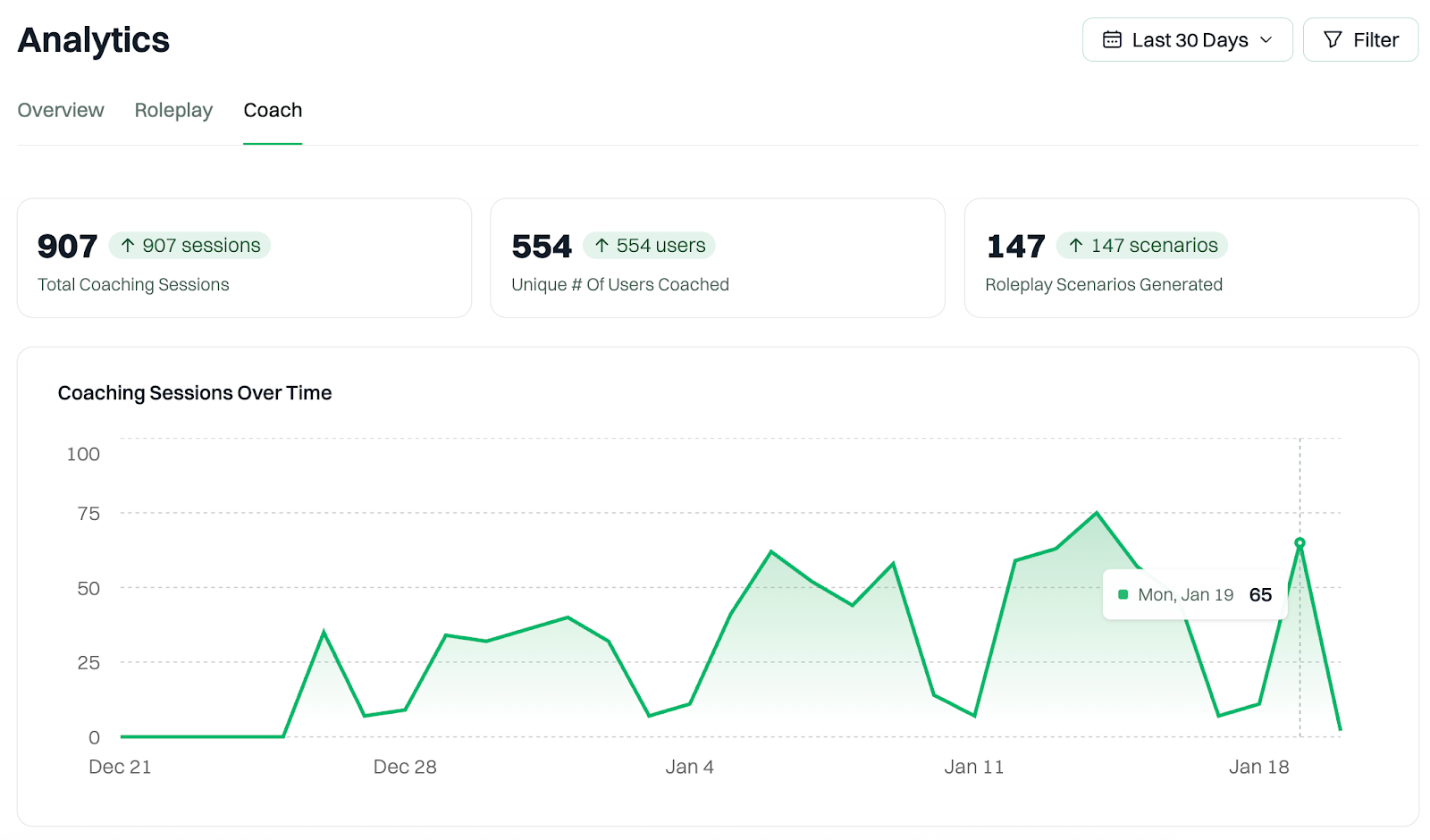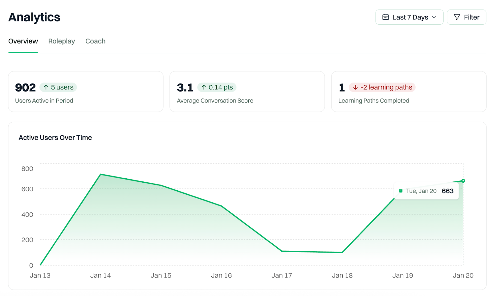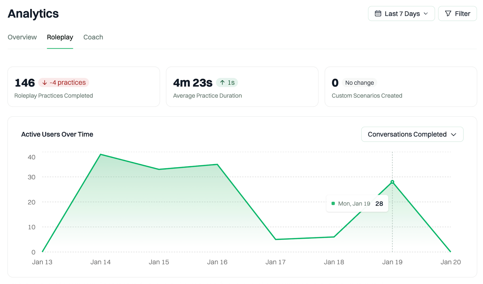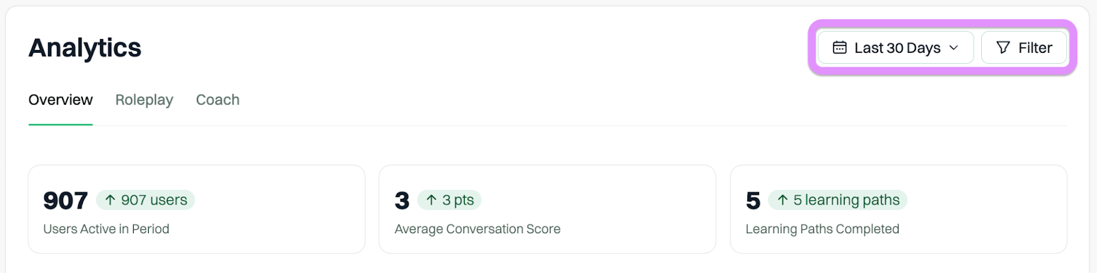 Your selected date range and user filters persist across the Overview, Roleplay, and Coach tabs until you change or clear them.