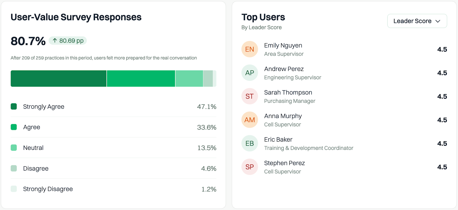 - Each user's Leader Score is a composite of their cumulative performance across six leadership skills (Clarity, Conversational Focus, Emotional Intelligence, Motivation, Goal Attainment, and Problem Solving), reflecting all of their practice history up to the end of the selected time period. .