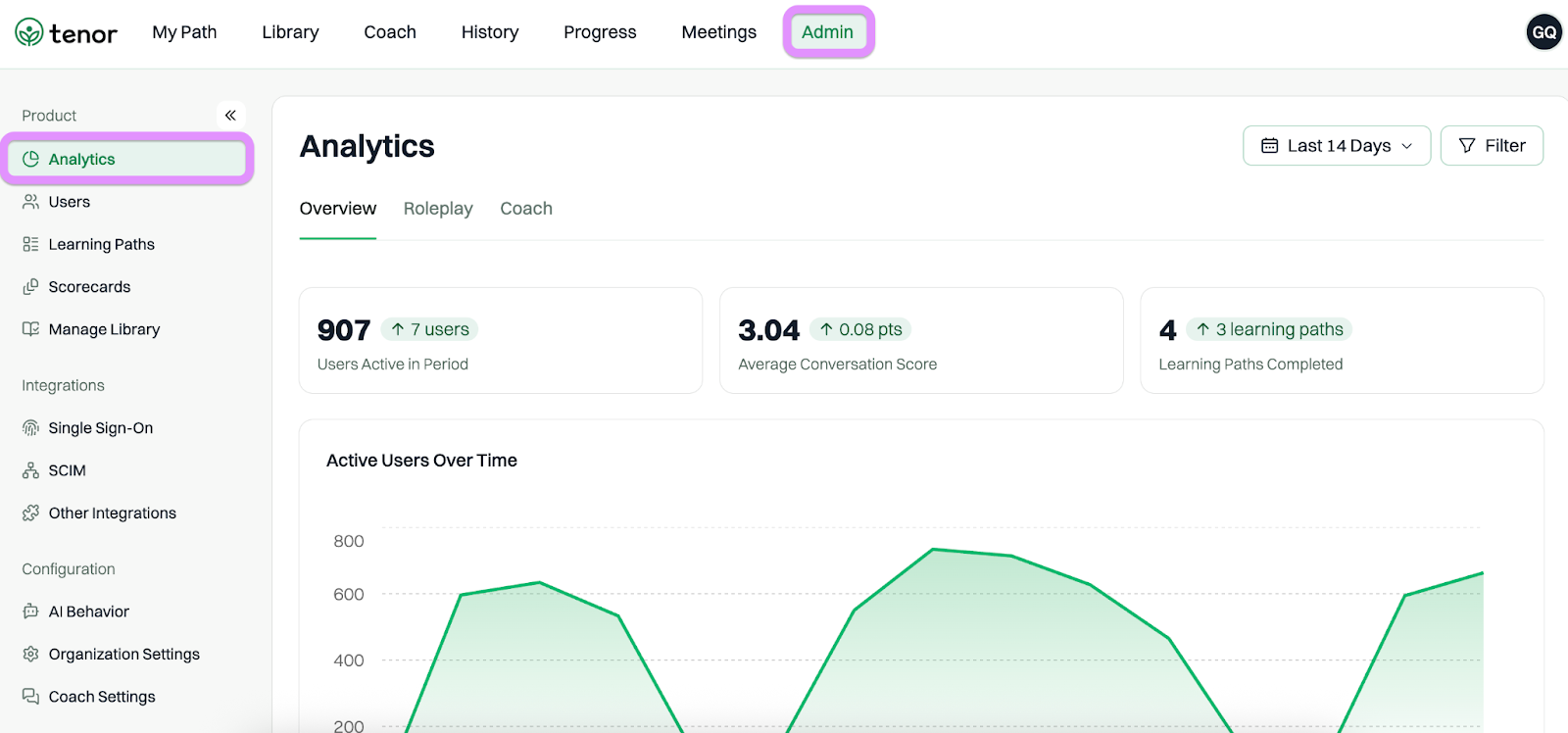 Tenor Analytics helps Admins understand how their organization is using Tenor β including overall activity, roleplay engagement, learning progress, and coaching usage.