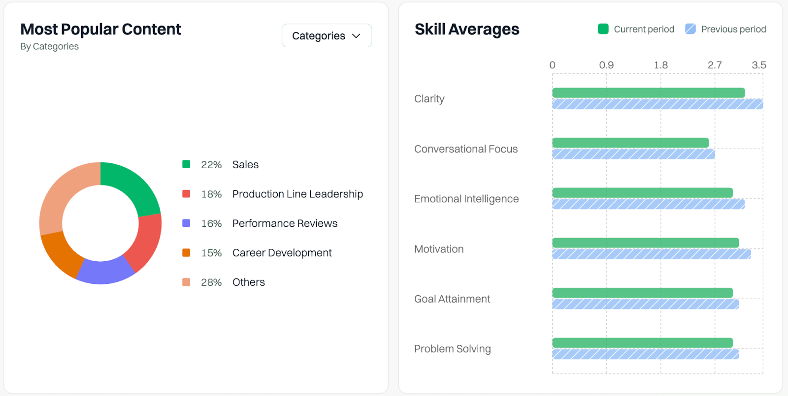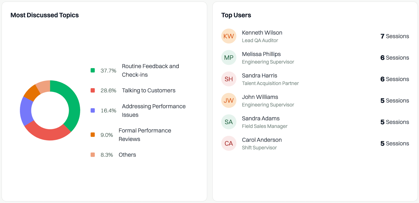 These are classified automatically by the system after each coaching session. The "Most Discussed Topics" chart shows the top 4 by session count, with the rest grouped as "Others."