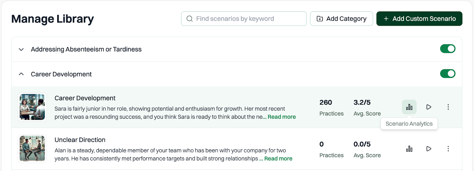 In addition to the main Analytics tabs, Tenor provides analytics for individual Learning Paths and Scorecards. These are accessible from the detail page of each Learning Path or Scorecard in the Admin Dashboard, and from the list of scenarios under each category in the Manage Library tab, rather than from the Analytics section.